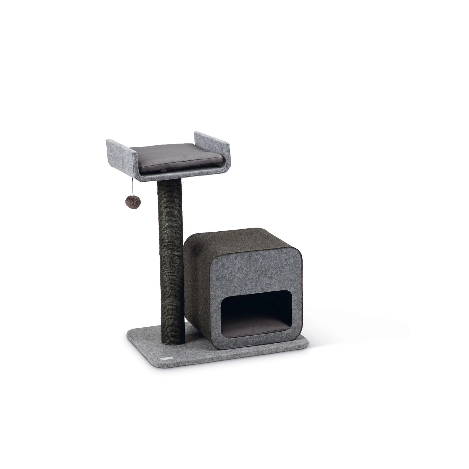 De Beeztees Flavie Krabpaal is zeer compact, maar voorziet toch in de slaap- en krabbehoefte van jouw kat. Dit krabmeubel bestaat uit een krabpaal met plateau en daarnaast een kattenhuisje. Dit meubel is gemaakt van vilt, wat het een stoere en mooie uitstraling geeft. Het plateau kan jouw kat gebruiken om alles in de gaten te houden of lekker uit te rusten. Ook in het huisje kan jouw kat lekker een dutje doen en zich even heerlijk terugtrekken na een hele middag krabben.