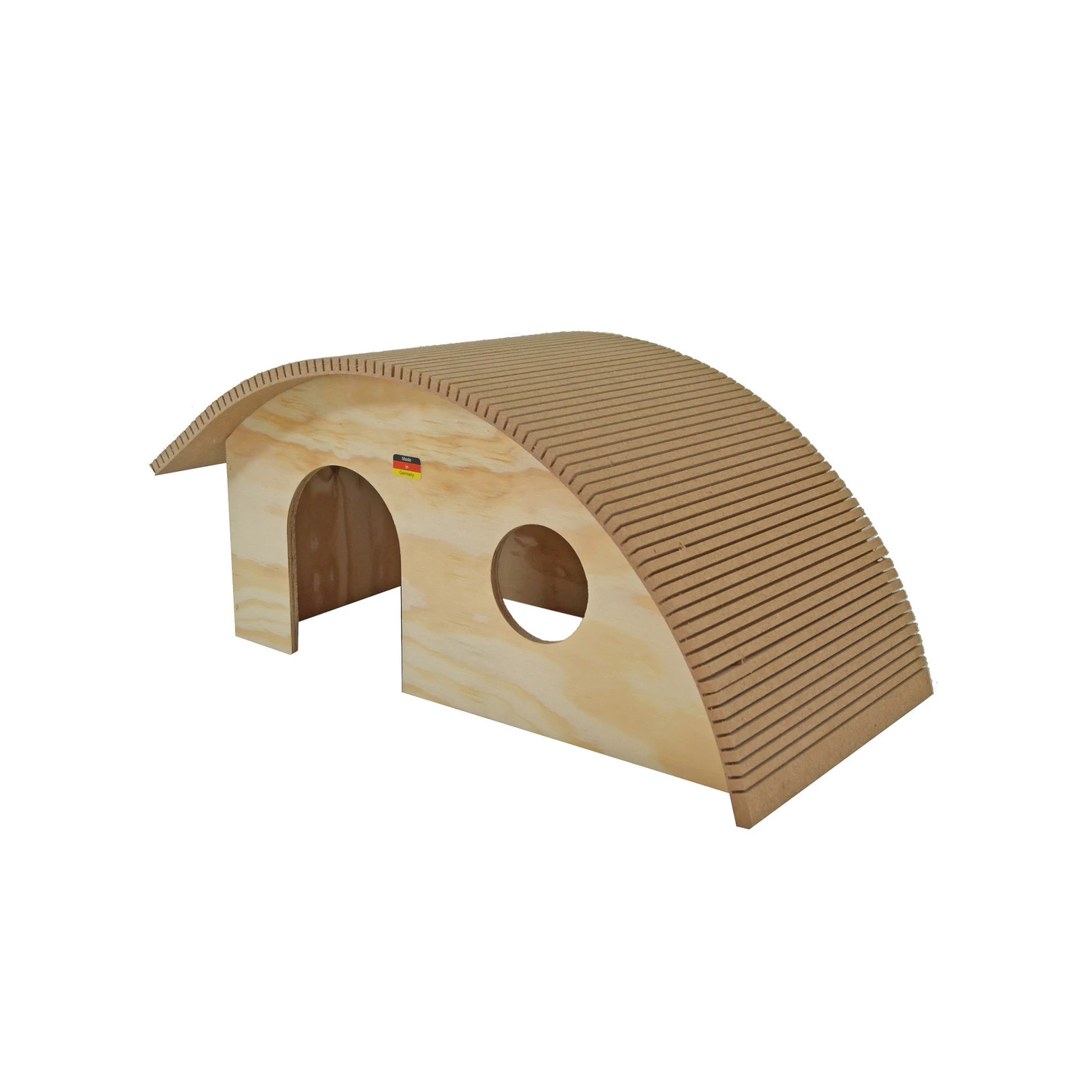 Dit prachtige deluxe design booghuis is zeer geschikt voor cavia’s en kleine tot middelgrote konijnen. Er is 1 ovale in-/uitgang en 1 rond kijkraam. Het rond gebogen dak is gemaakt van hardboard en er kan veilig aan geknaagd worden. Dit huis kan ook gebruikt worden als brug. De open bodem maakt schoonmaken makkelijker.