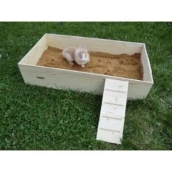 Deze grenen houten zandbak is geschikt voor kleine tot middelgrote konijnen en eventueel ook voor degoes en chinchilla’s.