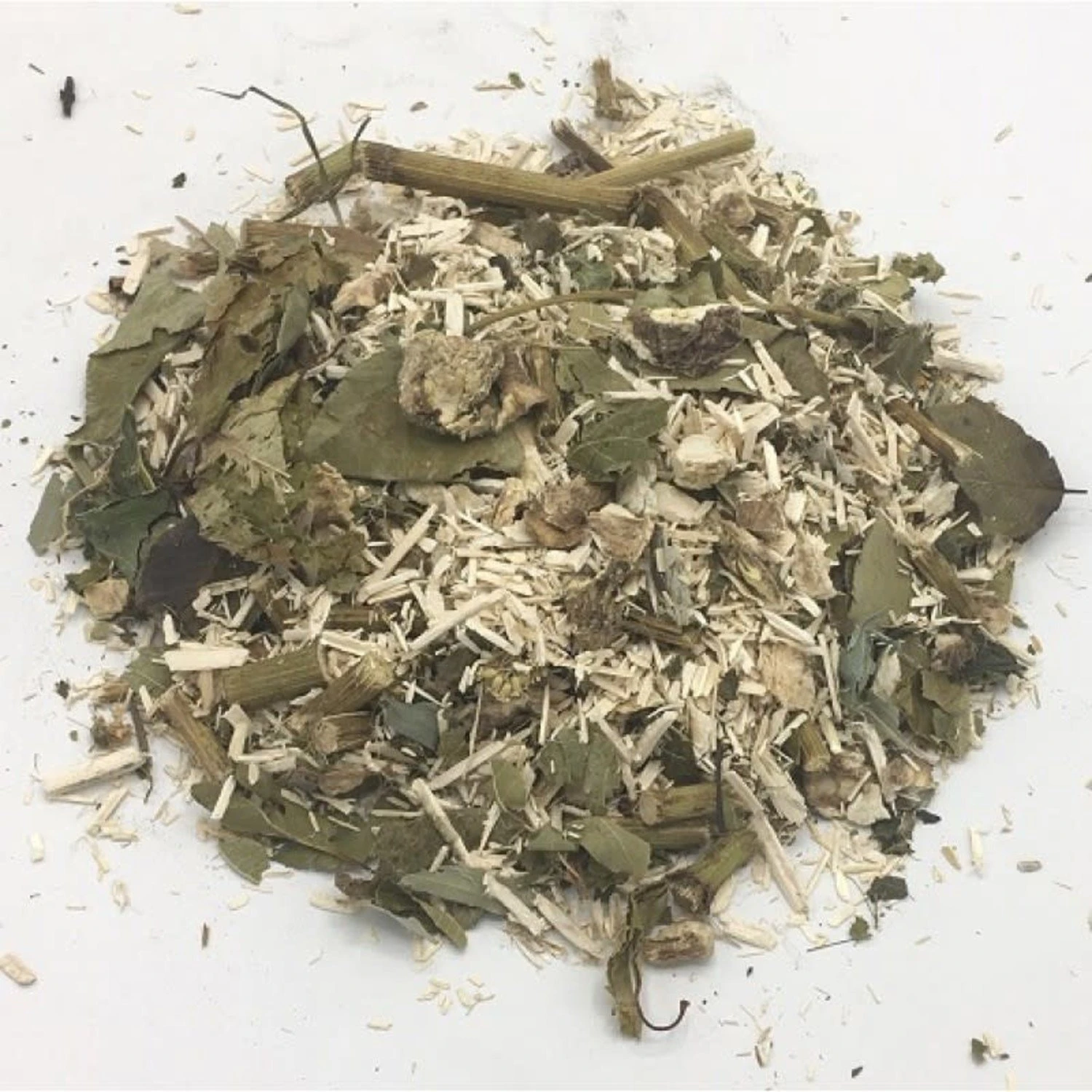 Maisbladeren, berkenbladeren, hazelaarbladeren, mirabelbladeren, zonnehoedbladeren, kersenbladeren, appelbladeren, perenbladeren, frambozenbladeren, brandnetelbladeren, aardbeibladeren, moerbeibladeren, paardenbloembladeren, kaasjeskruid, wilgenbladeren, walnoot bladeren, cichoreiwortel, aardpeerplant en hennepstrooisel.