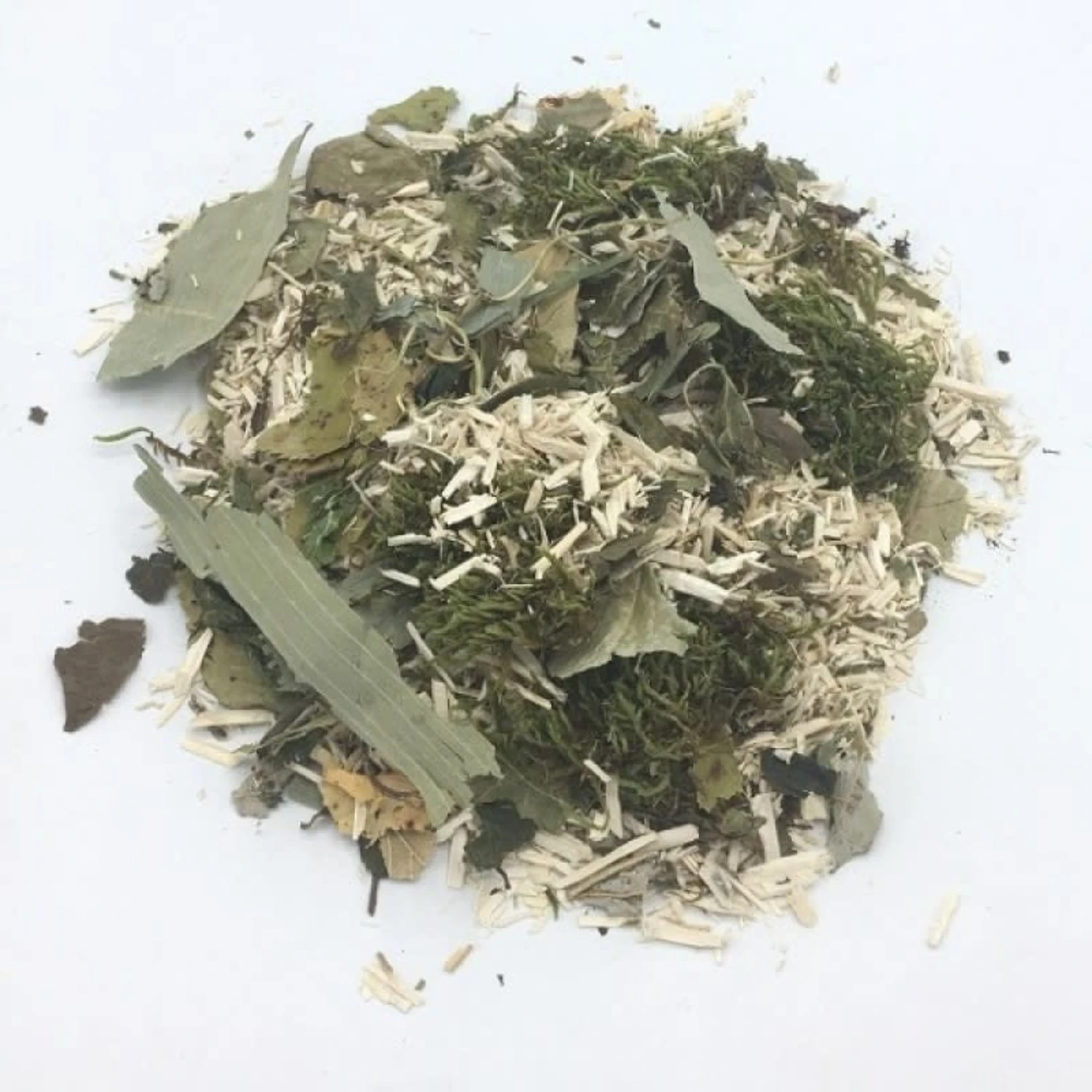 Mos, maisbladeren, zonnebloemblaadjes, berkenbladeren, hazelaarbladeren, Mirabelbladeren, zonnehoedbladeren, kersenbladeren, appelbladeren, perenbladeren, frambozenbladeren, brandnetelbladeren, aardbeibladeren, moerbeibladeren, paardenbloembladeren, kaasjeskruid, wilgenbladeren, walnoot bladeren en hennepstrooisel