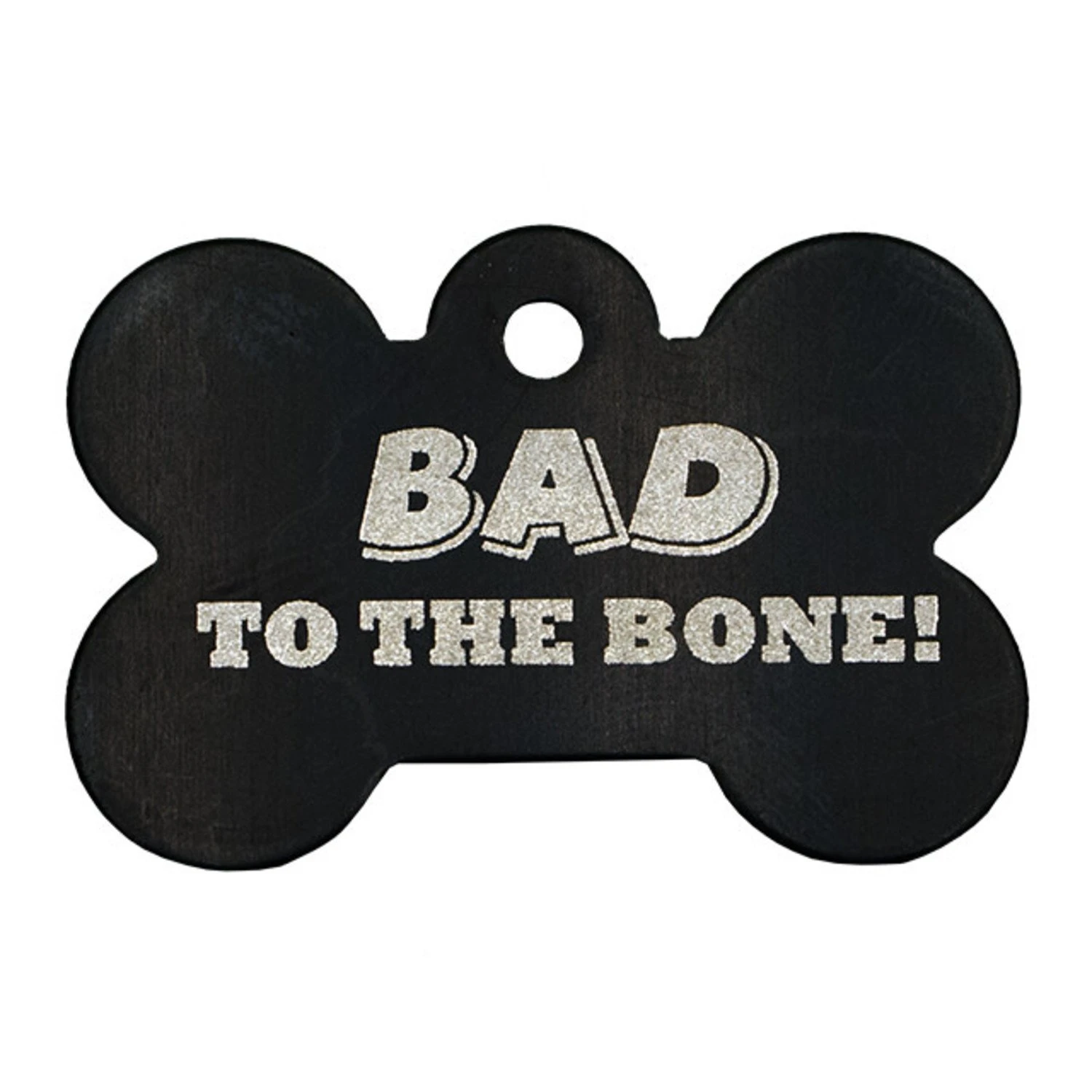 Kleur: Zwarte achtergrond met witte tekst: BAD TO THE BONE! erop