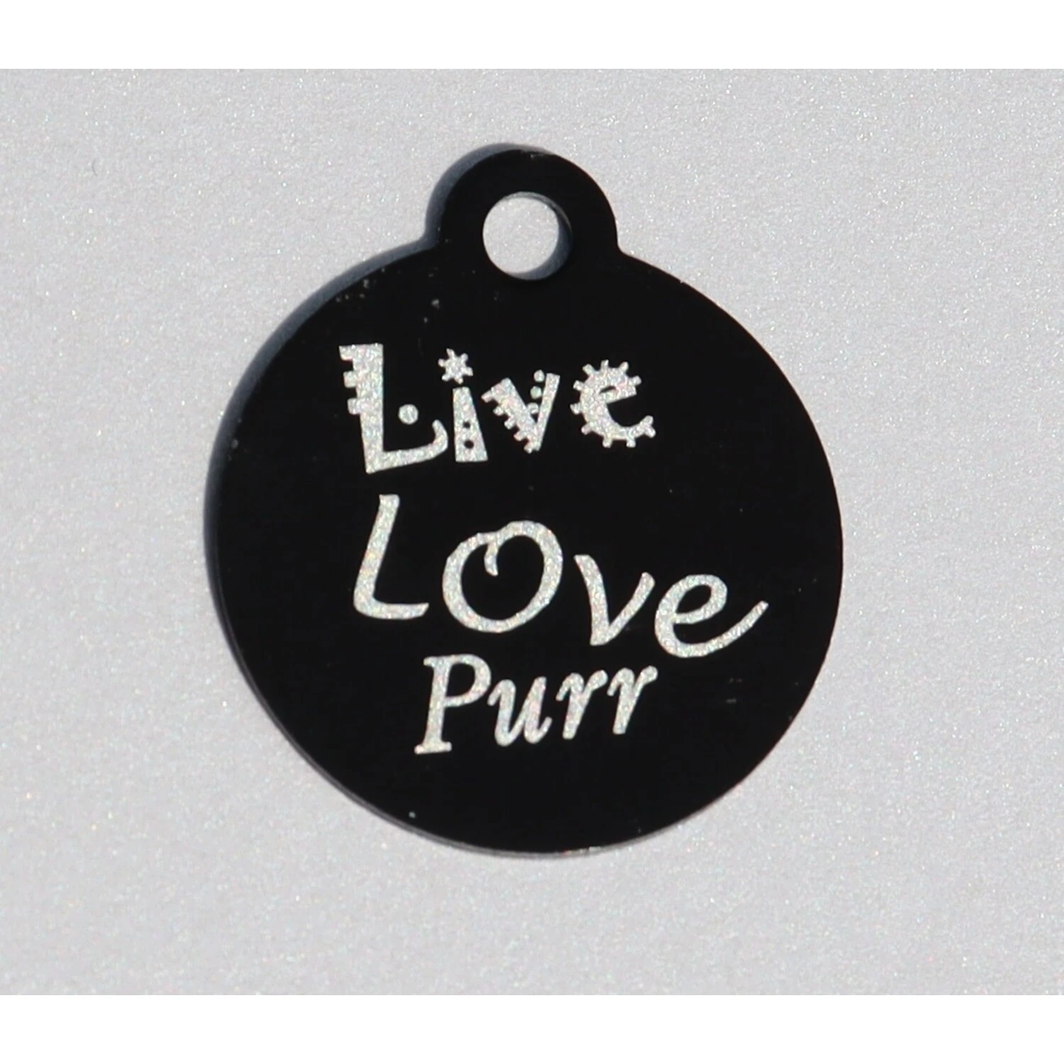 Kleur: Zwarte achtergrond met witte tekst: Live Love Purr erop