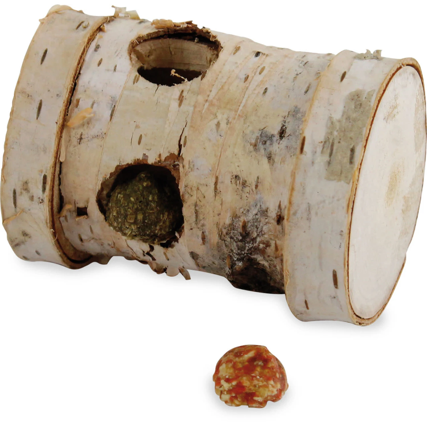 Vul de schroefbare houten rol met wat “JR Grainless Drops” en schroef hem weer vast. Laat je dier ermee spelen. Hij zal direct proberen zoveel mogelijk drops eruit te krijgen door te bewegen.