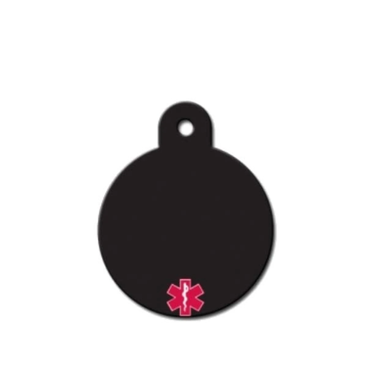 Mooie zwarte hondenpenning in ronde vorm met medical alert teken. Op de penning kan de naam van uw huisdier of uw telefoonnummer gezet worden.