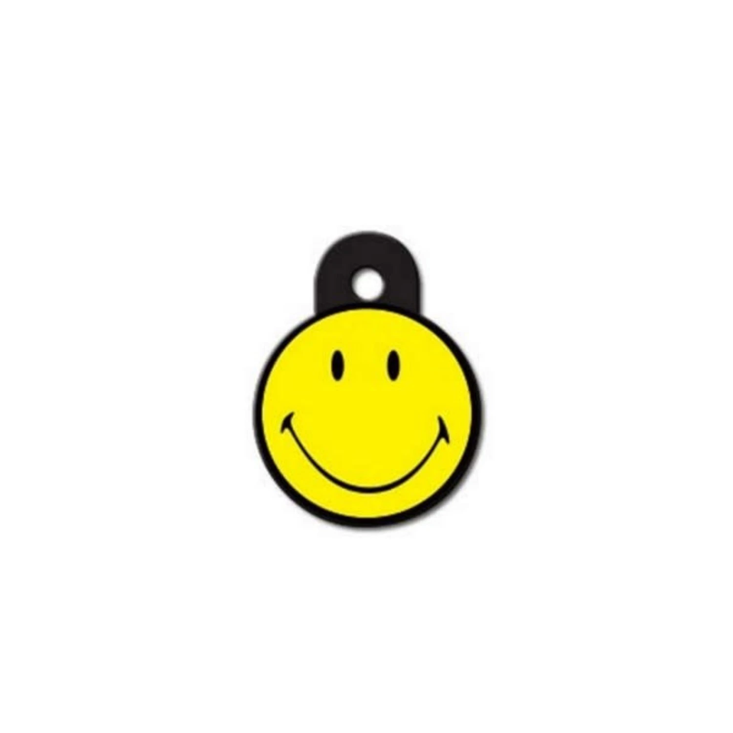 Mooie gele hondenpenning in ronde vorm met smiley print. Op de penning kan de naam van uw huisdier of uw telefoonnummer gezet worden.