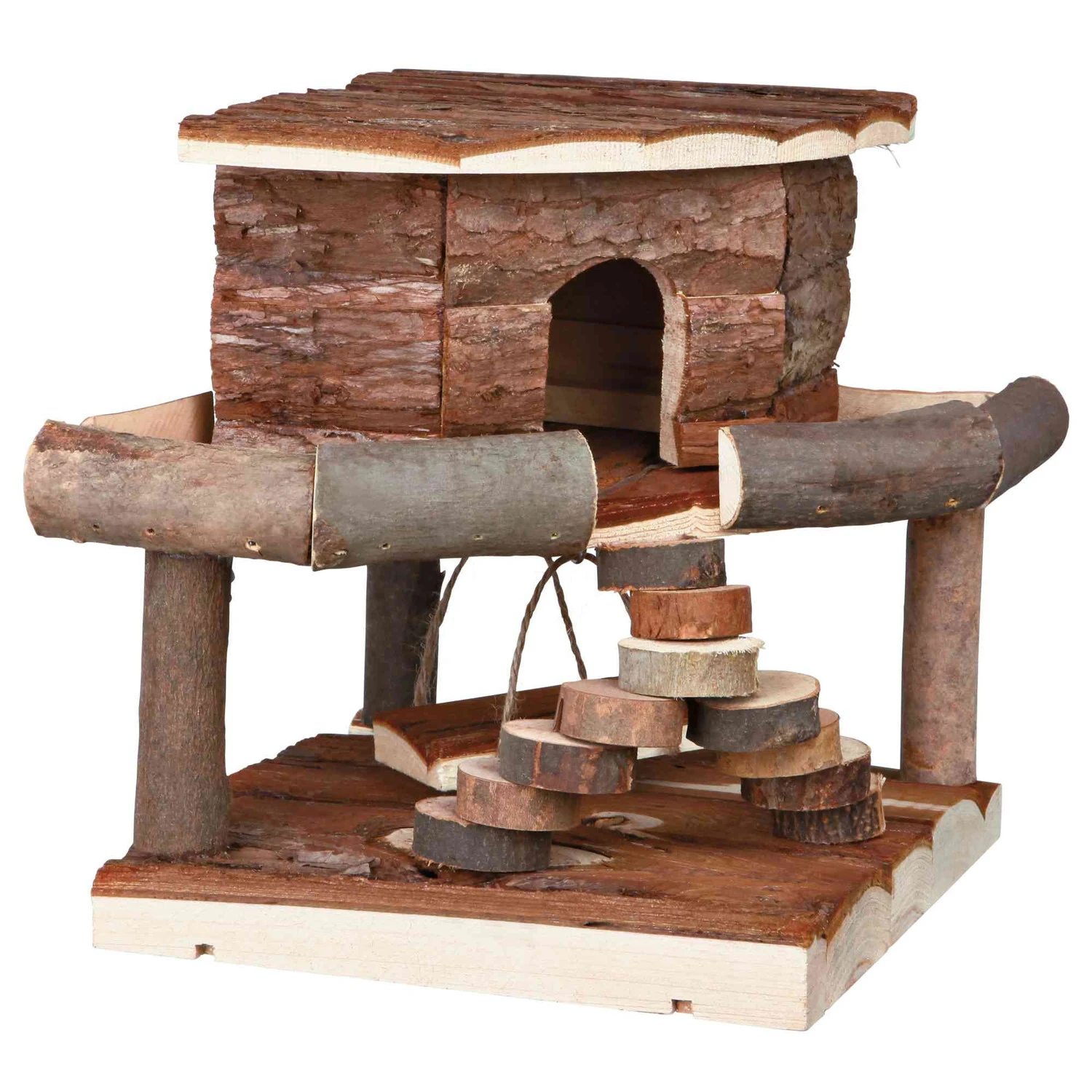 Dit super schattige huis is geschikt voor dwerghamsters en muizen. Het is volledig gemaakt van natuurhout en de houten schommel heeft touwen van sisal.